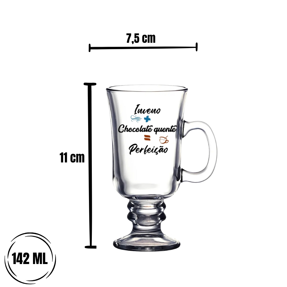 A Taça Irish Coffee Libbey 142ml “Inverno + Chocolate Quente = Perfeição” é perfeita para quem ama aquele chocolate quente cremoso nos dias frios. Produzida em vidro de alta qualidade, ela combina beleza, funcionalidade e charme. A estampa especial deixa o momento ainda mais aconchegante, ideal para tardes de inverno, cafés especiais ou como presente carinhoso.