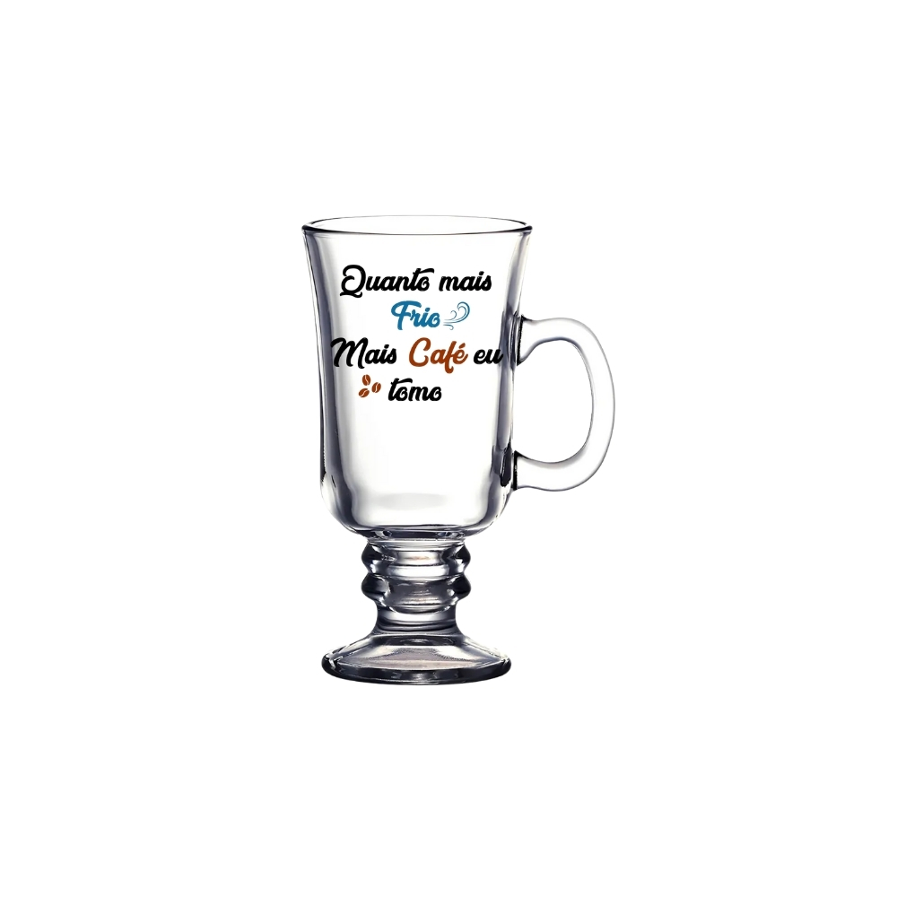 A Taça Irish Coffee Libbey 142ml “Quanto Mais Frio, Mais Café Eu Tomo” é perfeita para os apaixonados por bebidas quentes. Feita em vidro resistente e com pegada confortável, ela mantém o charme clássico do irish coffee, adicionando uma estampa divertida que combina com dias frios e momentos acolhedores. Ideal para cafés especiais, chocolate quente e bebidas cremosas. Uma peça única para quem quer transformar o ritual do café em um momento ainda mais gostoso.