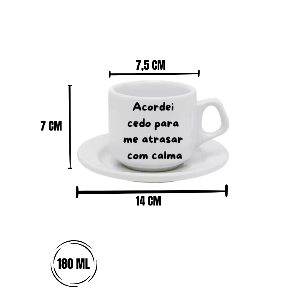 Comece o dia com bom humor e estilo com esta xícara com pires estampada com a frase: ‘Acordei cedo para me atrasar com calma’. Ideal para quem sabe que até a correria merece uma pausa para um bom café, ela combina funcional